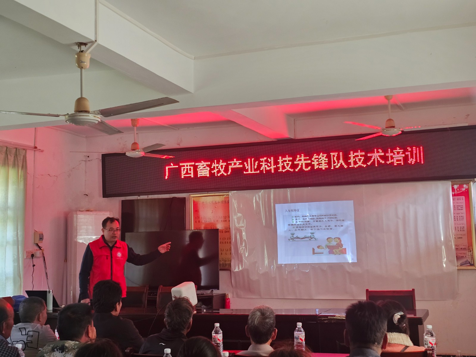 2025年12月9日,广西兽医生物技术重点实验室畜牧产业科技先锋队一行3人赴防城港市,面向基层畜牧技术人员和农村养殖户开展畜禽养殖关键技术专题培训,围绕当前养殖过程中的常见疫病,系统讲解了早期识别、生物安全防控、科学用药及规范诊治等实用技术,并现场指导绿色健康养殖技术应用推广。
